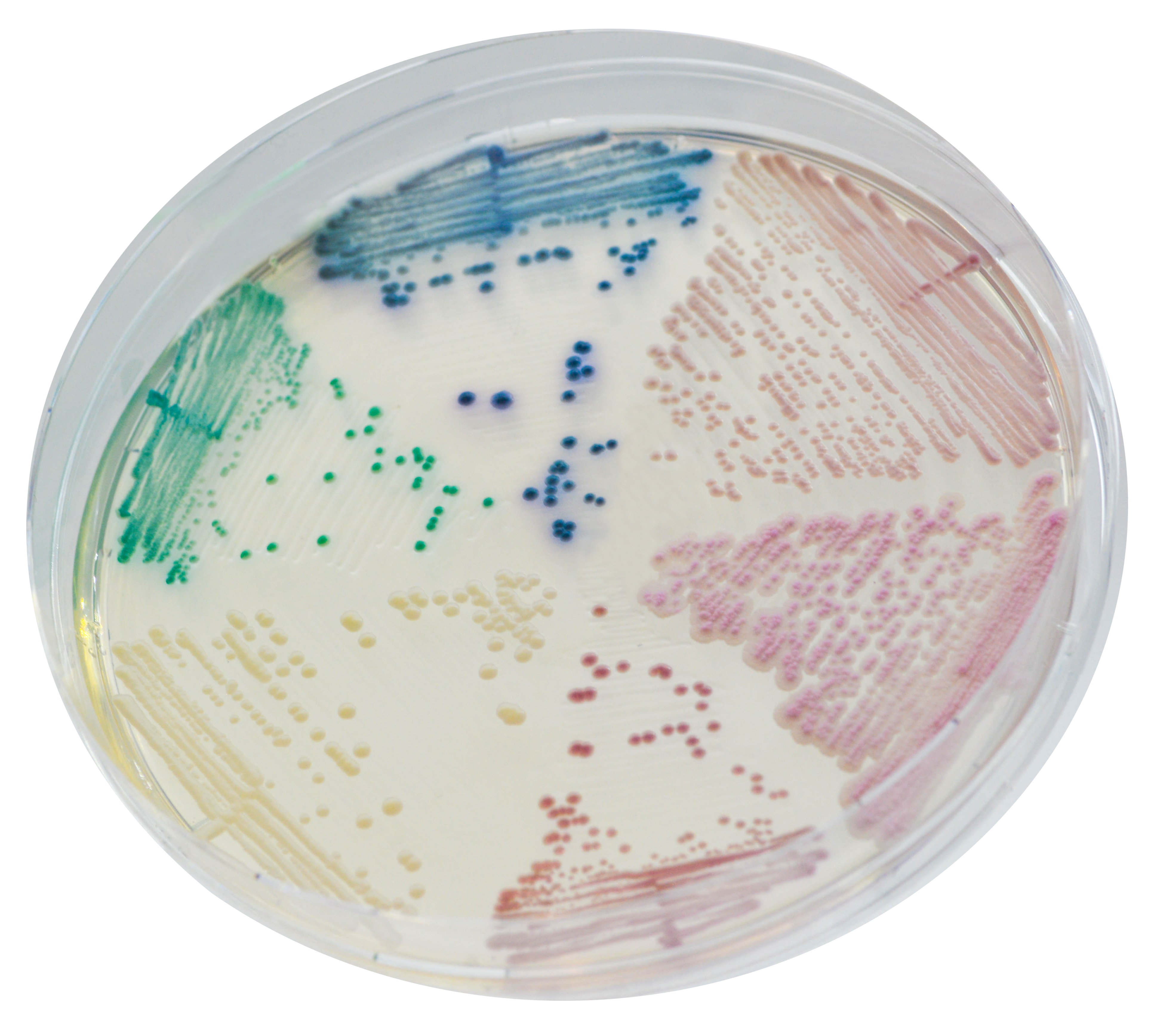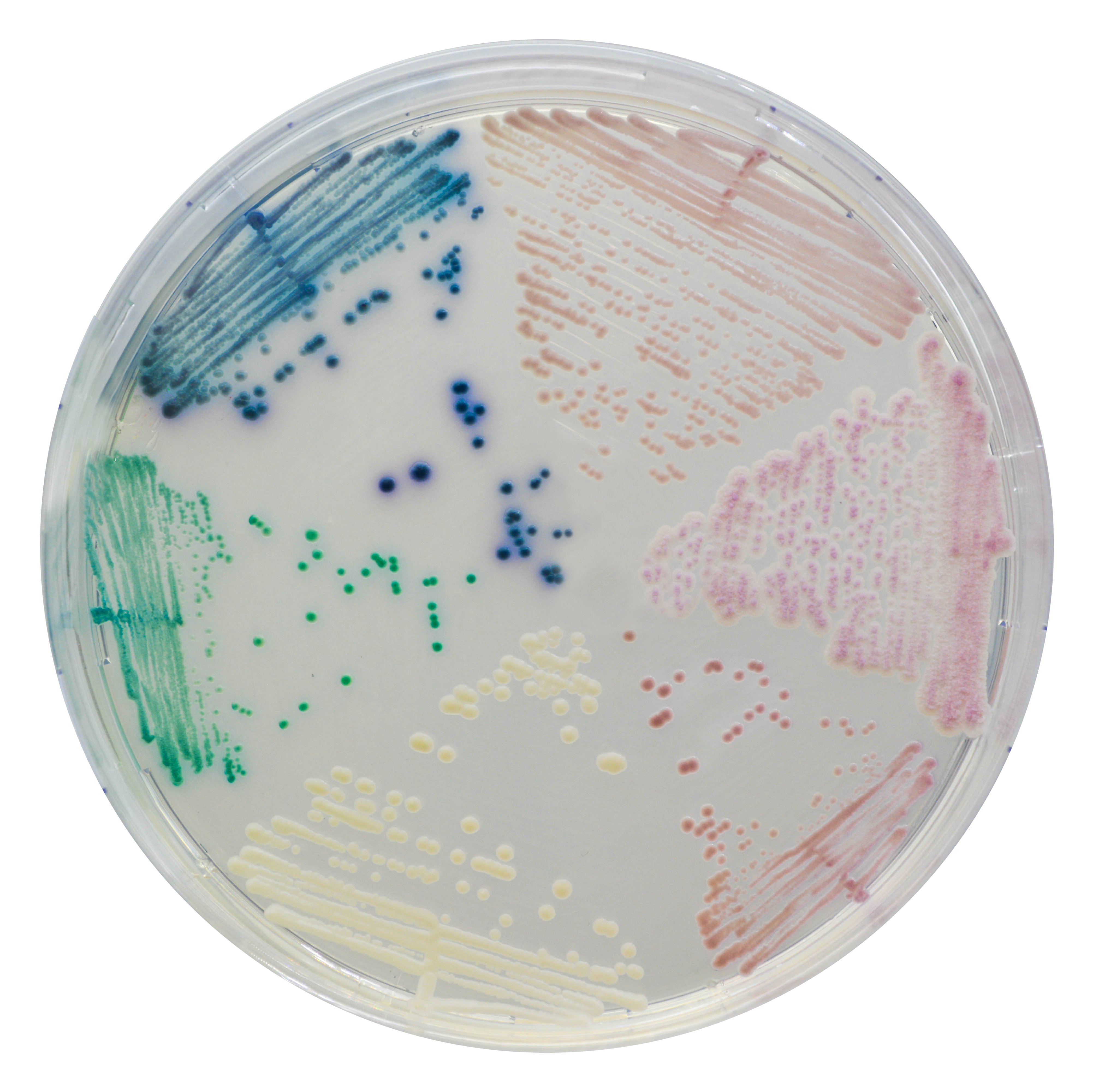 1. High contrast: Intense colony colouration helping to differentiate species and mixed cultures.