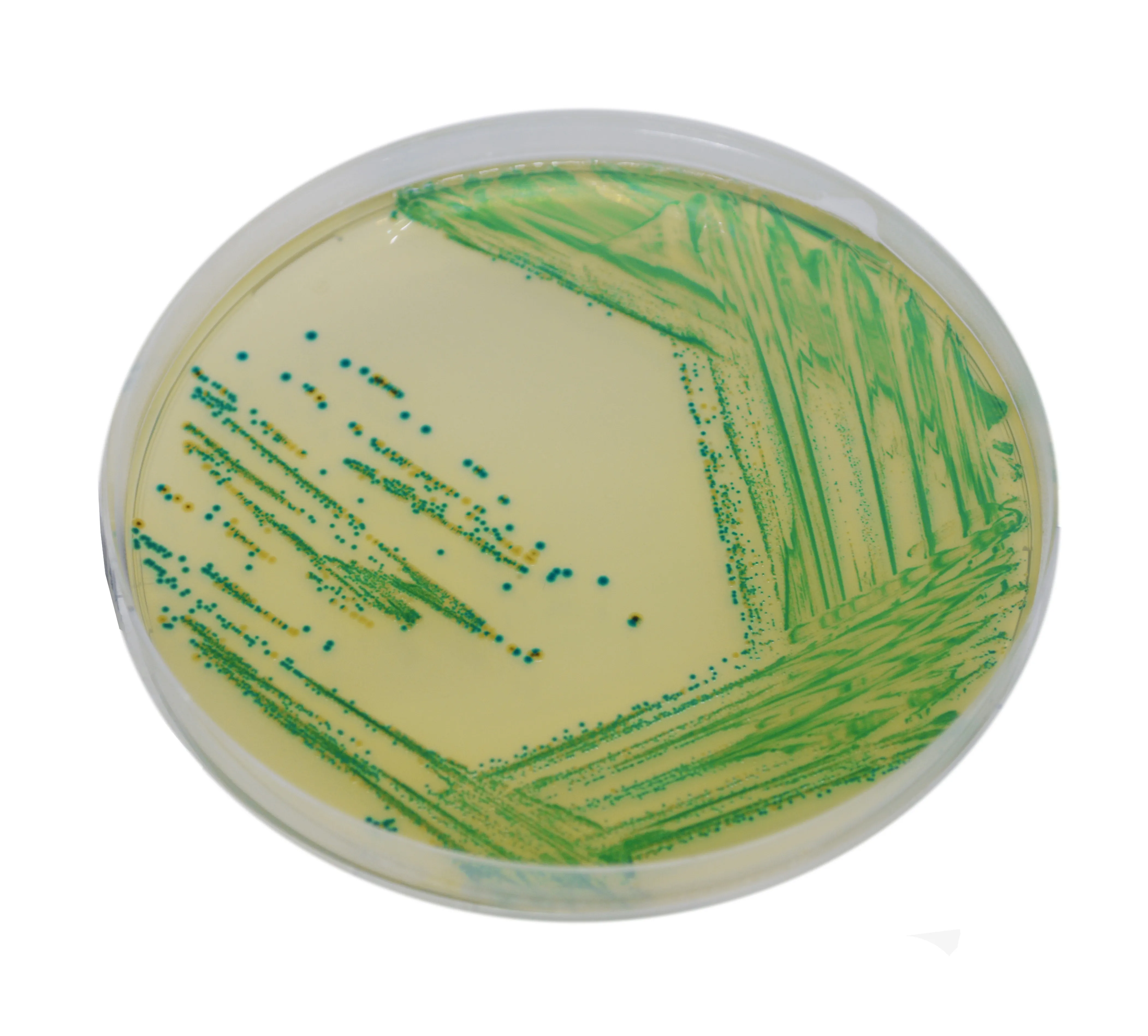 2. Intense green to blue colonies: Cronobacter spp. will grow in green to blue colonies while most other bacteria will be inhibited or grow in colorless colonies, after incubation at 41.5 °C for 24 h.