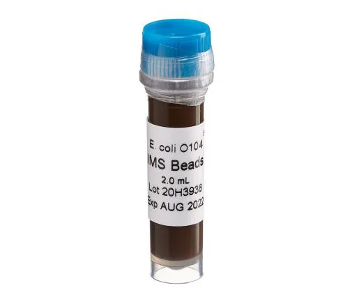 The E. coli O104 IMS beads are immunomagnetic separation beads designed for the rapid and selective concentration of Escherichia coli serogroup O104 to help with their confirmation on selective confirmation agars. The E. coli O104 IMS beads should be used as part of the USDA-FSIS test protocol described in the USDA-FSIS Microbiology Laboratory Guidebook (MLG) Chapter 5B “Detection, Isolation and Identification of Top Seven Shiga-Toxin Producing Escherichia coli Strains (STEC) from Meat Products and Carcass and Environmental Sponges”. The IMS beads provided in the kit are coupled to antibodies against E. coli serotype O104. The E. coli O104 IMS beads should be used as part of the USDA-FSIS test protocol described in the USDA-FSIS Microbiology Laboratory Guidebook (MLG) Chapter 5B “Detection, Isolation and Identification of Top Seven Shiga-Toxin Producing Escherichia coli Strains (STEC) from Meat Products and Carcass and Environmental Sponges”. The MLG utilizes sample enrichment in modified tryptic soy broth, followed by multiplexed Real Time-PCR assays targeting stx1, stx2 and eae genes and the wxz gene in the O-antigen gene clusters of the six serogroups, and then immunomagnetic separation (IMS) followed by plating onto Rainbow Agar (mRBA). Colonies are then tested for specific O antigens using latex agglutination and positive colonies are purified on Sheep Blood Agar (SBA) and confirmed using PCR and biochemical identification.
