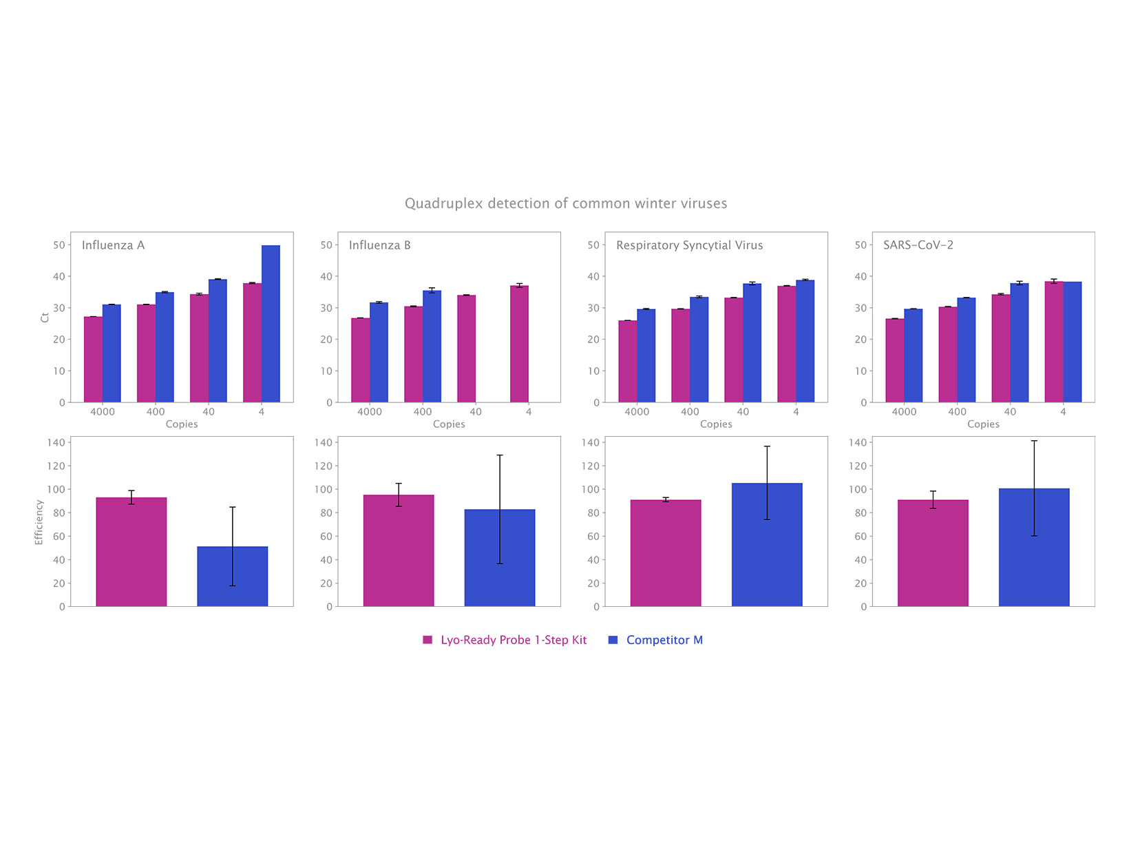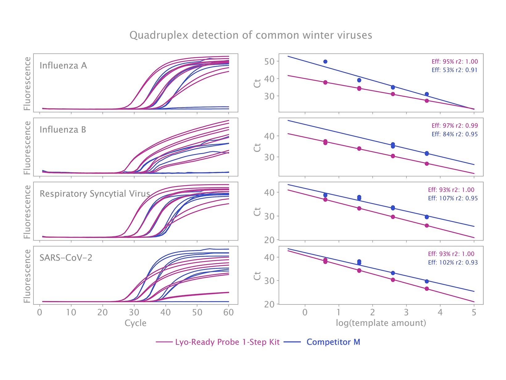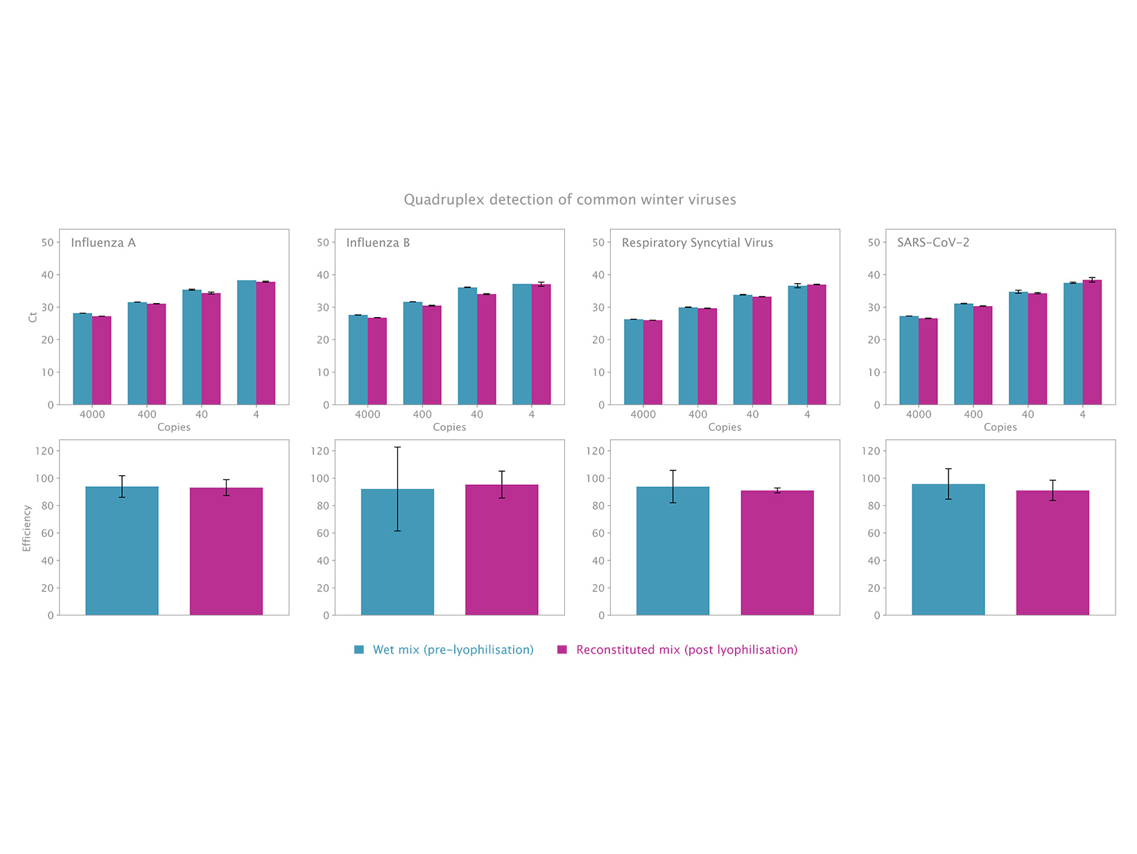 Bộ kit đã được xác nhận cho việc phát hiện SARS-CoV-2 trong chế độ đơn (xem Hình 1) và đa hình (xem Hình 2) và cung cấp hiệu suất đáng tin cậy mà không bị mất hiệu suất hoặc độ nhạy sau khi đông khô.