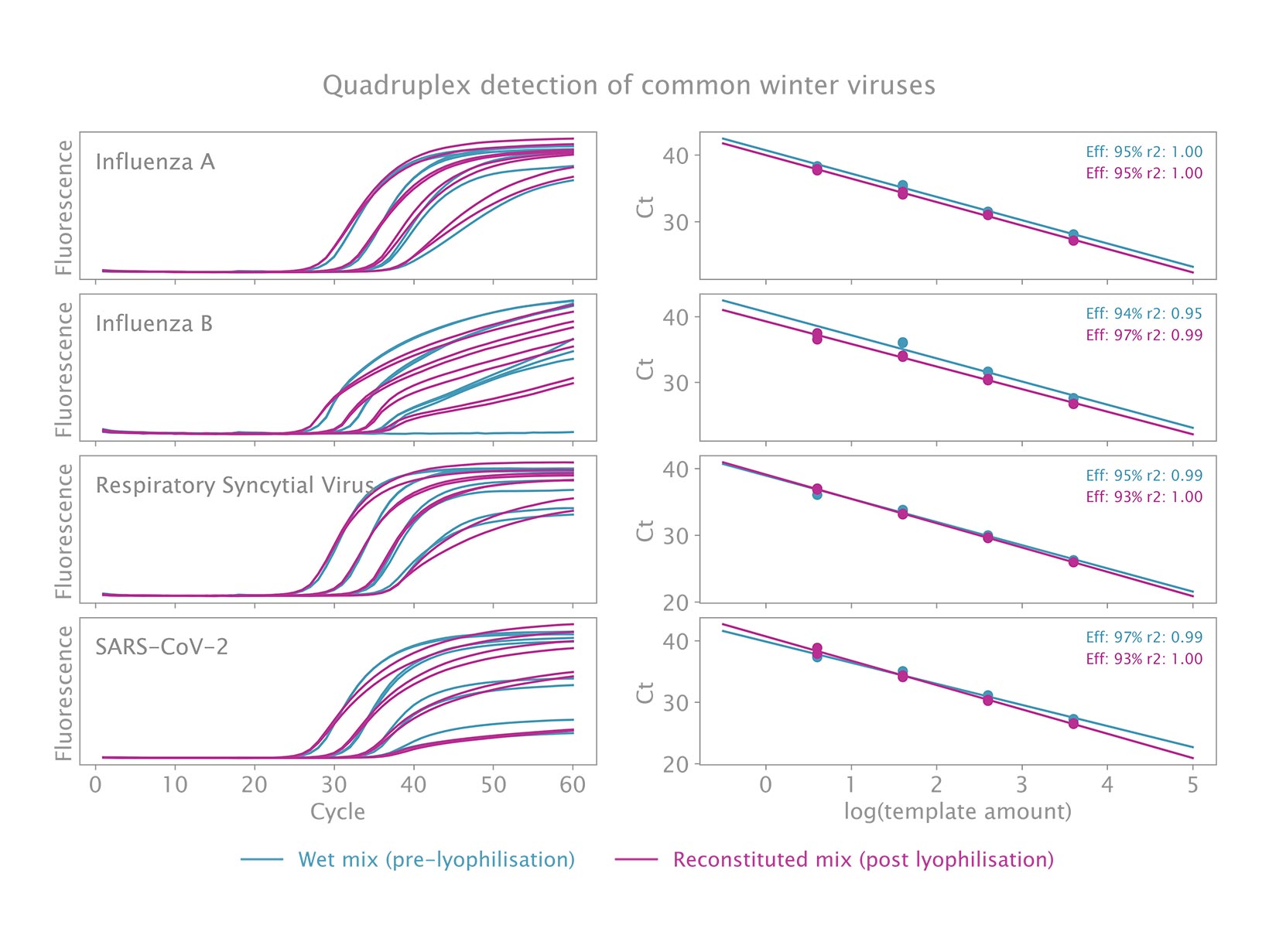 Quá trình đông khô mang lại nhiều lợi ích bao gồm lưu trữ ở nhiệt độ phòng, thời gian bảo quản kéo dài và tăng tính linh hoạt trong thể tích mẫu. Bộ kit đã được tối ưu hóa để cung cấp hiệu suất cao như bộ kit RT-qPCR 1 bước tiêu chuẩn của chúng tôi sau khi đông khô.