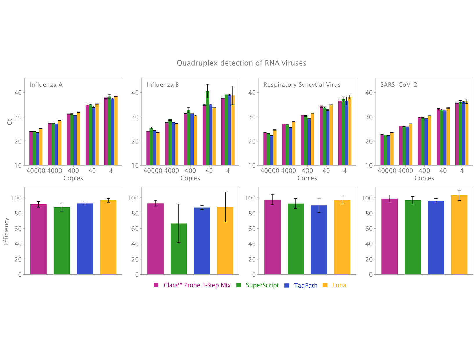 Việc tối ưu hóa rộng rãi làm cho hỗn hợp này phù hợp cho tất cả các loại mục tiêu axit nucleic. Chúng tôi đã thử nghiệm nó với các virus ARN phổ biến, bao gồm SARS-CoV-2, RSV, Influenza A và B, các gen housekeeping tiêu chuẩn, như g-actin và GAPDH, cũng như các mục tiêu ADN. Sự hiện diện của RTase trong hỗn hợp không ảnh hưởng đến việc khuếch đại trực tiếp các mục tiêu ADN, có nghĩa là bạn có được cùng độ hiệu quả cao cho dù bạn đang phát hiện các chuỗi ADN hay ARN. Hỗn hợp này rất ổn định và cho thấy sự tái lập mạnh mẽ giữa các lần chạy, mang lại độ tái lập cho dữ liệu của bạn và sự tự tin trong các kết luận thí nghiệm mà bạn rút ra.
