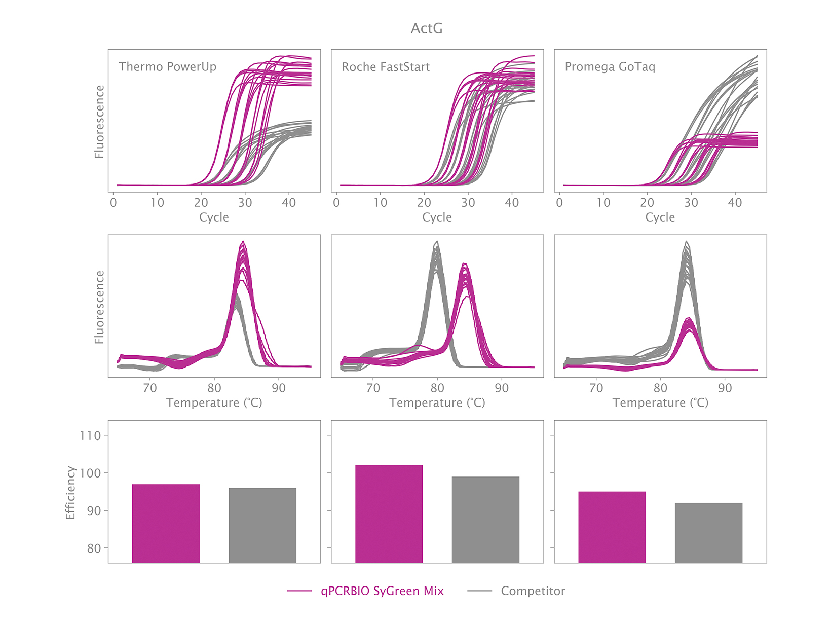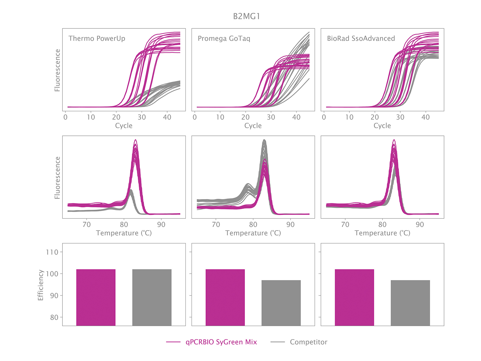 Hỗn hợp 2x của chúng tôi sử dụng một thuốc nhuộm intercalating DNA độc quyền, không cản trở PCR, không giống như các thuốc nhuộm huỳnh quang phổ biến khác. Những cải tiến làm tăng độ nhạy và tính đồng nhất của qPCRBIO SyGreen® Mix trong điều kiện chu kỳ tiêu chuẩn cũng cho phép hiệu suất hàng đầu trong điều kiện chu kỳ nhanh và siêu nhanh.