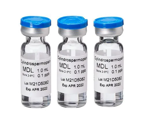 Các dung dịch nghiên cứu Giới hạn phát hiện (MDL) cho phương pháp Cylindrospermopsin được sử dụng để chứng minh khả năng phân tích Cylindrospermopsin bằng cách sử dụng ELISA Cylindrospermopsin của Eurofins Abraxis.